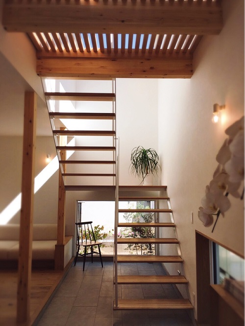 吹き抜けからリビングに差し込む光、落ち着きのある証明配置、特大のウッドデッキなど