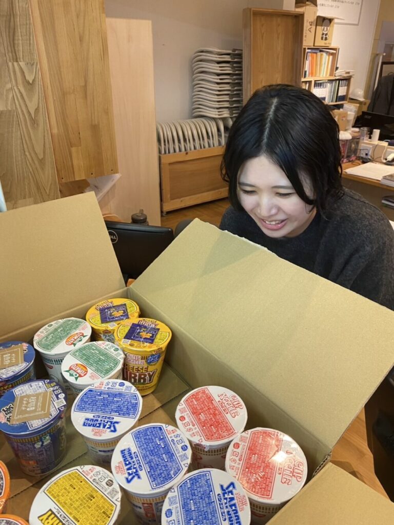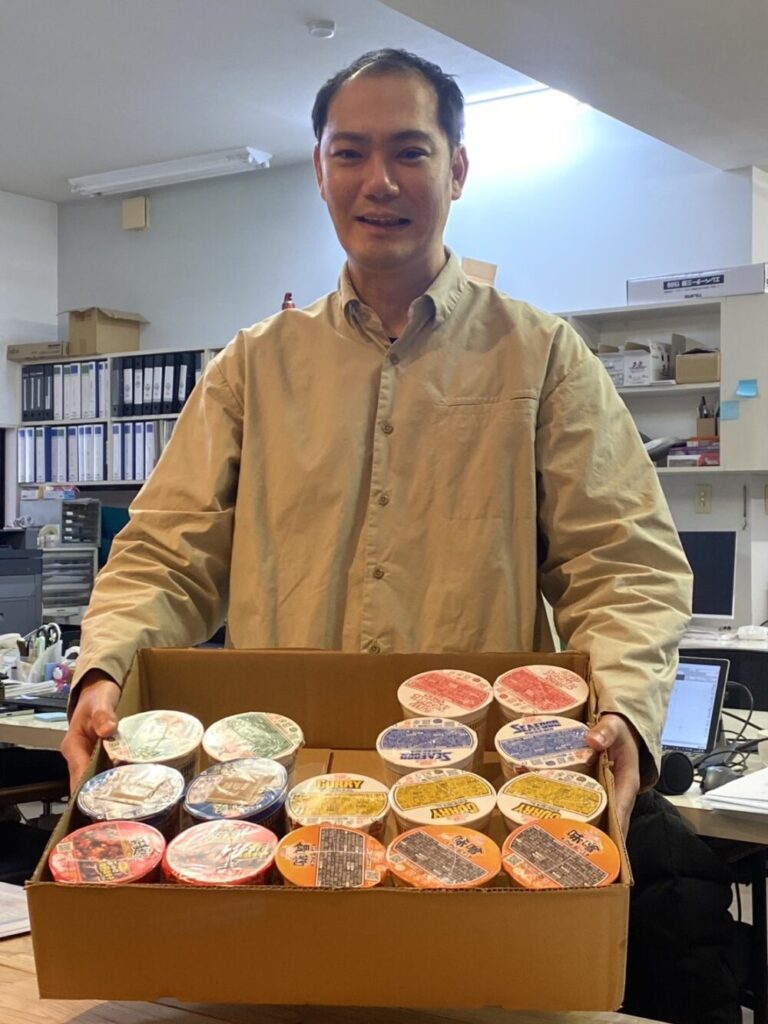 箱に入った大量のカップ麺を手に売りますよ~と降臨した樋宮さん。