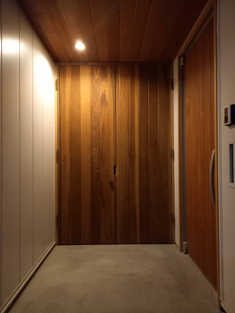ポーチの天井と同じ木を張ってもらい外収納の扉を作ってもらいました。