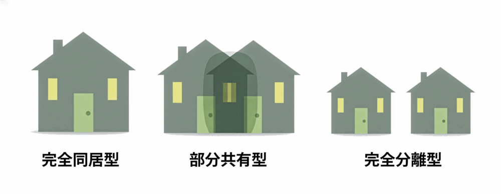 二世帯住宅には、大きく分けて完全同居・部分共有・完全分離の3つのタイプがあります。