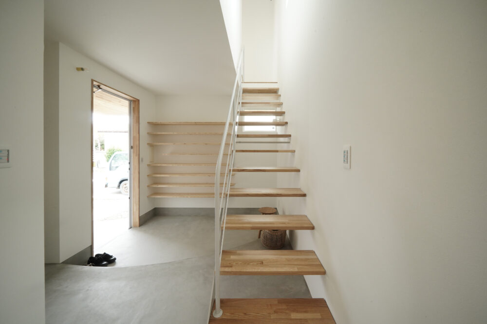 玄関のドアを開けると、そこには広々としたコンクリートの空間。壁にはアウトドアグッツや外道具がたくさん収納できます。自転車やキャンプ道具を並べて「見せる収納」も楽しめます。