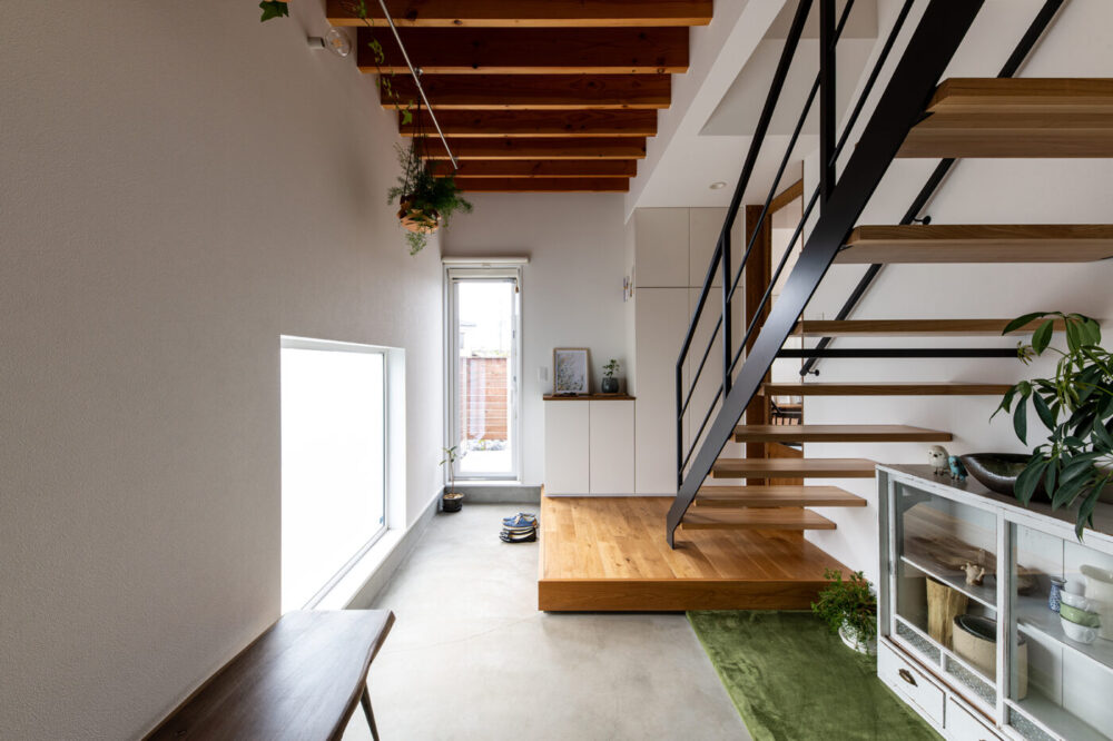 土間(どま)とは、家の中でありながら、「靴を履いたまま過ごせる空間」のことです。 昔は炊事場や作業場として使われていましたが、現代では玄関を拡張したスペースや、リビングの一部を土間にするスタイルが人気です。素材はコンクリート、モルタル、タイル、天然石などが一般的です。