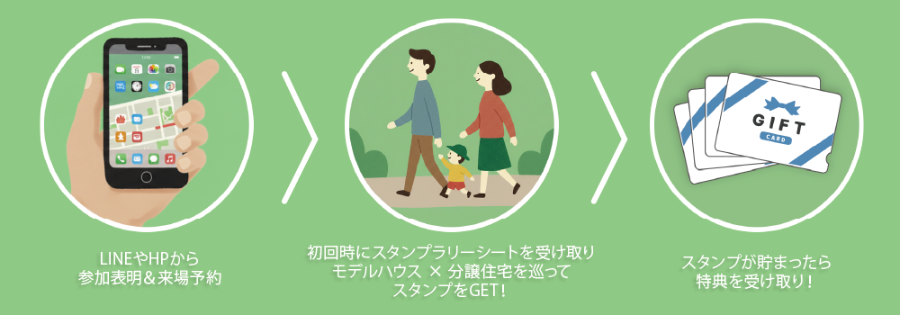 STEP2. スタンプラリーシートを初回ご案内時に受け取り、モデルハウスや分譲住宅を巡ってスタンプをGET