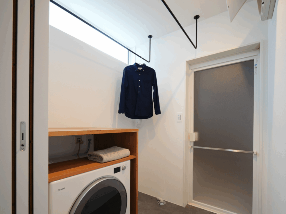 脱衣スペースには、雪国には嬉しいランドリースペースつき。物干し竿が2箇所あるので家族全員分たっぷり干せる。