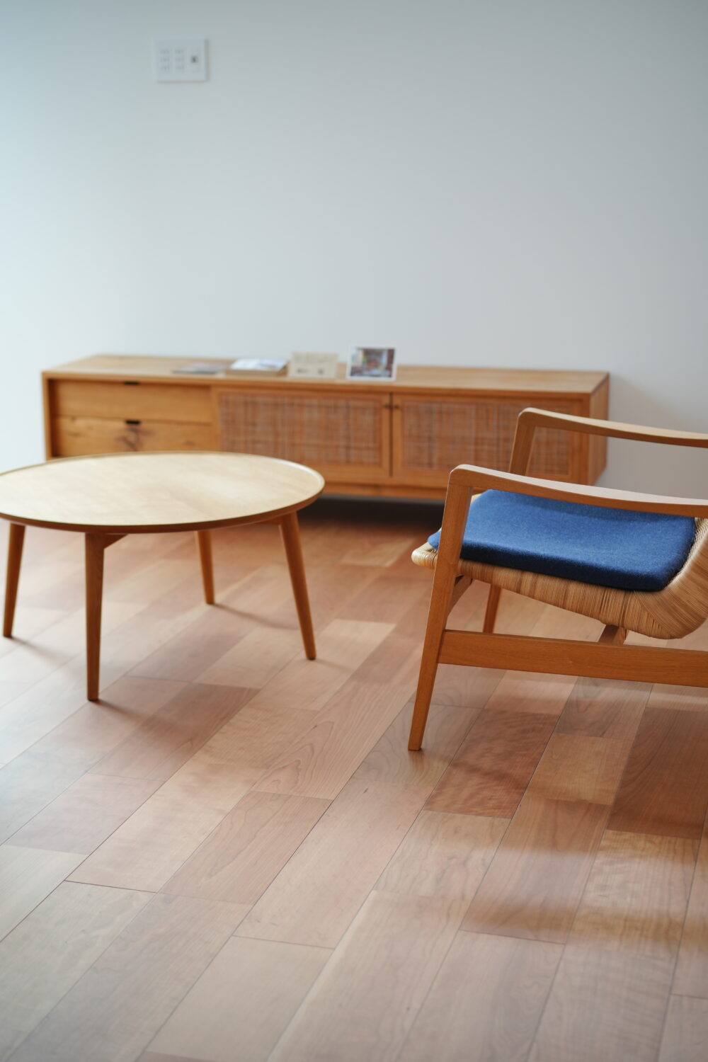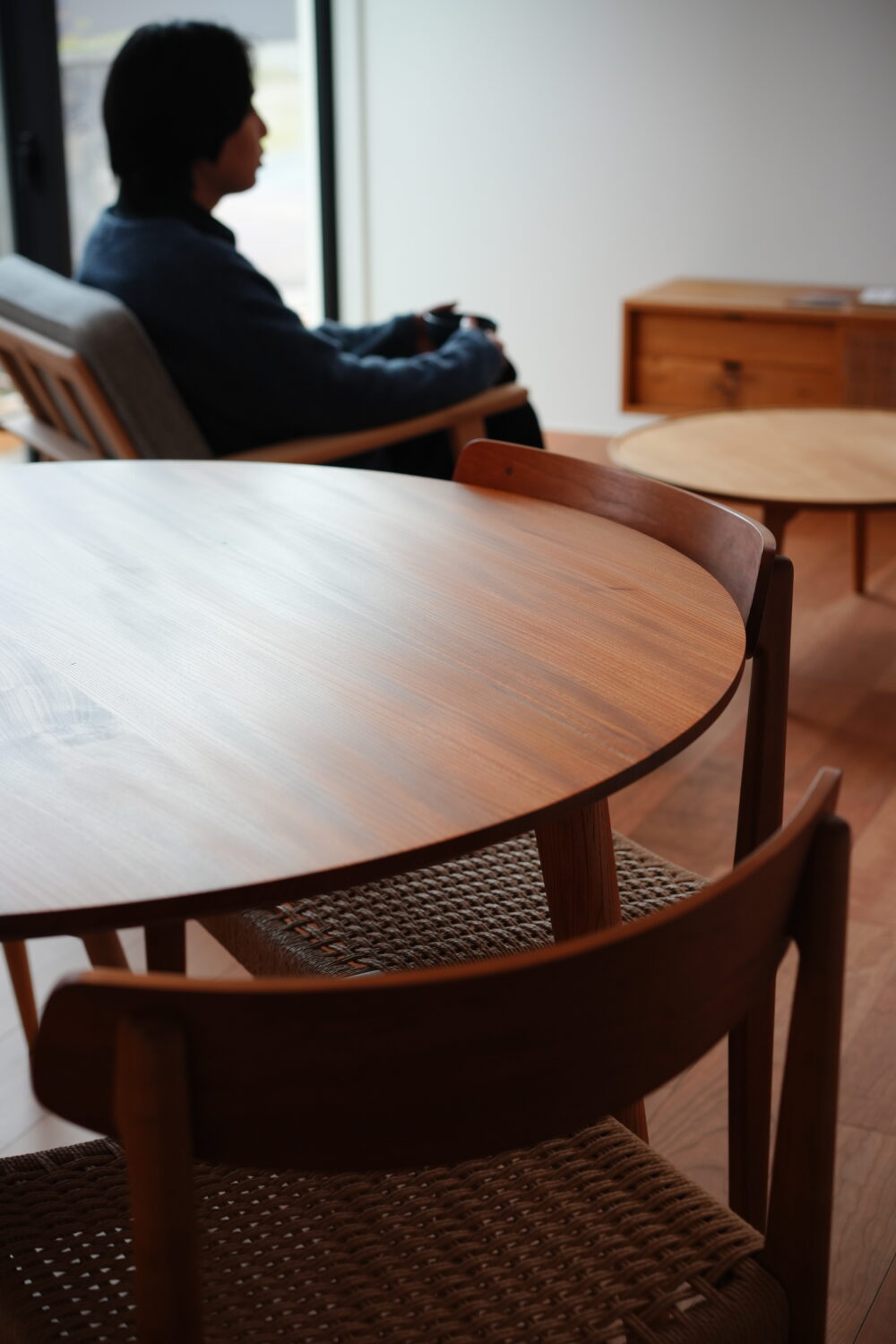 1人掛けソファーやローテーブルなど、素材感や木の手触りまで実際に体験できます↓