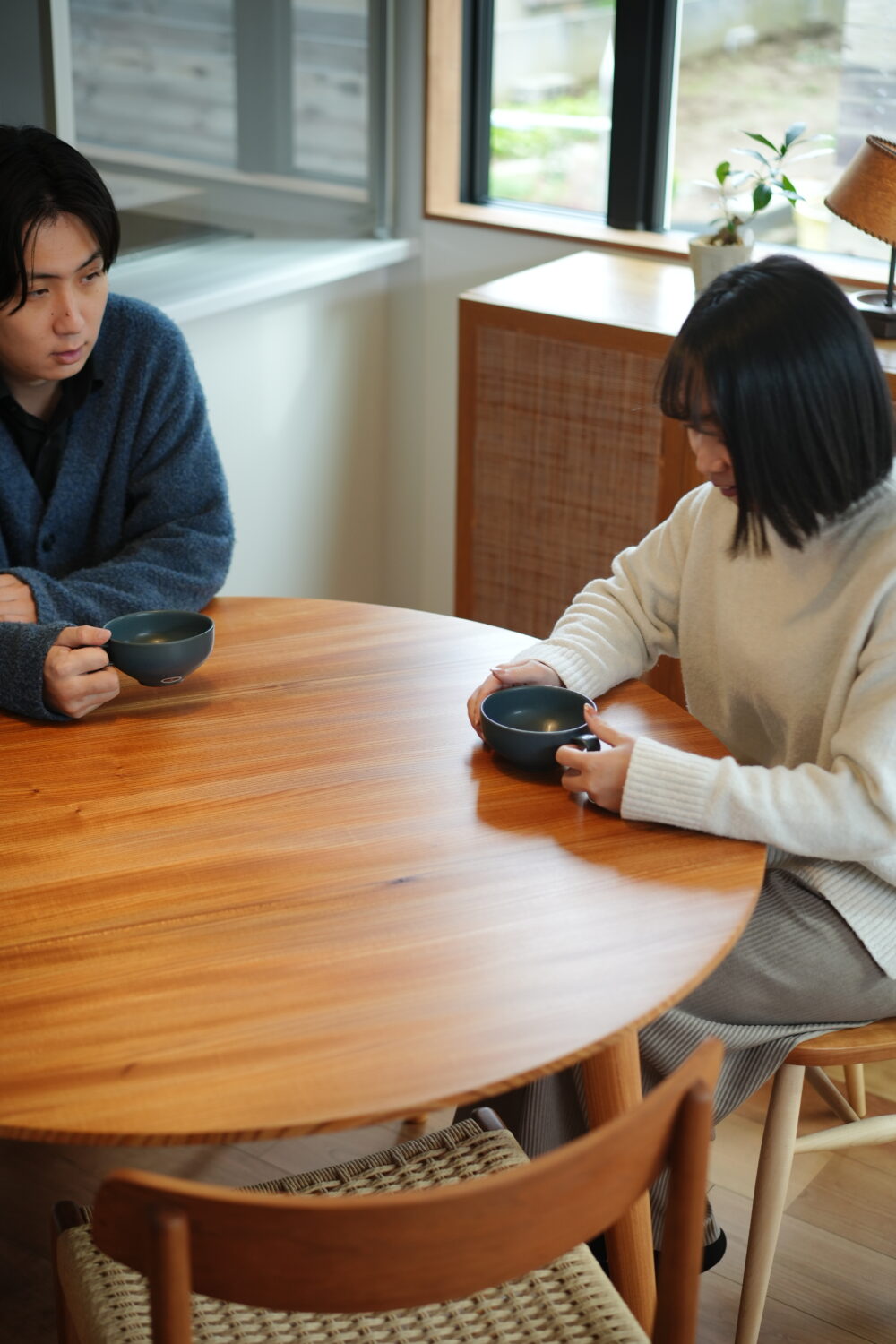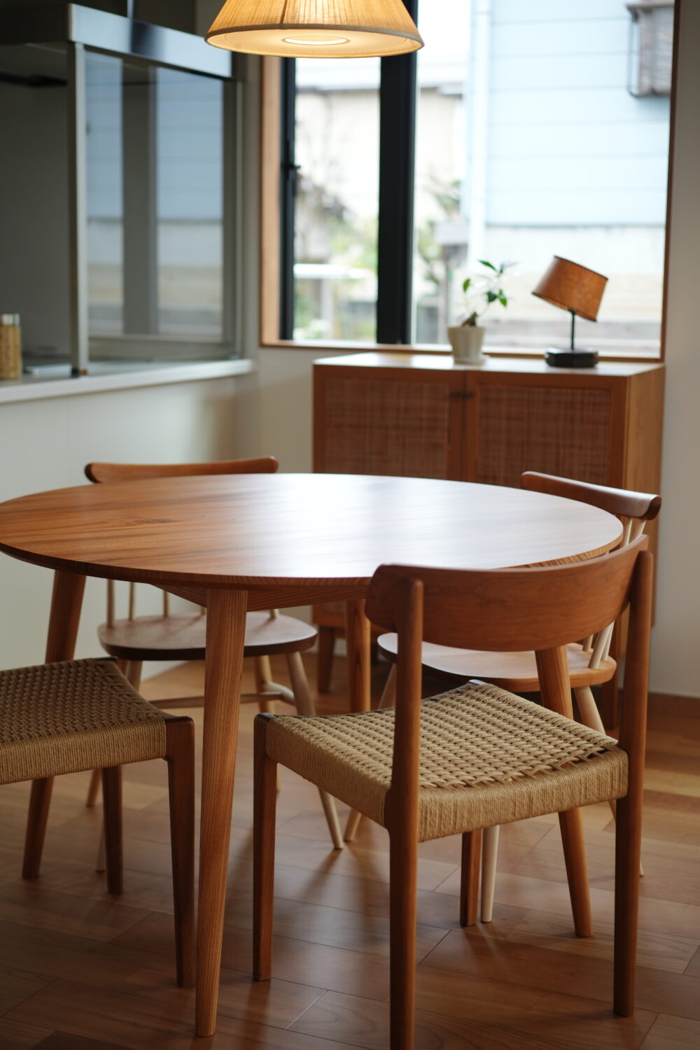 LDKのアクセントになる円テーブルは、オーナー様自ら選んだ「nine」さんのオーダー家具。