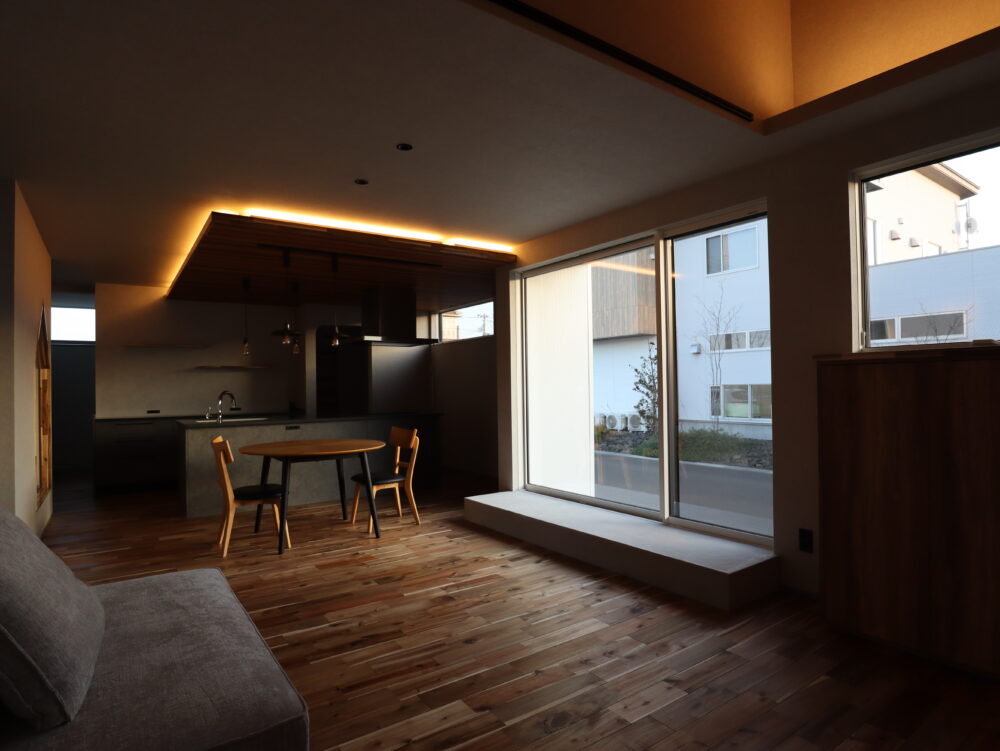 やわらかな間接照明をメインに採用した、家族みんなが心からくつろげる落ち着いたLDK。