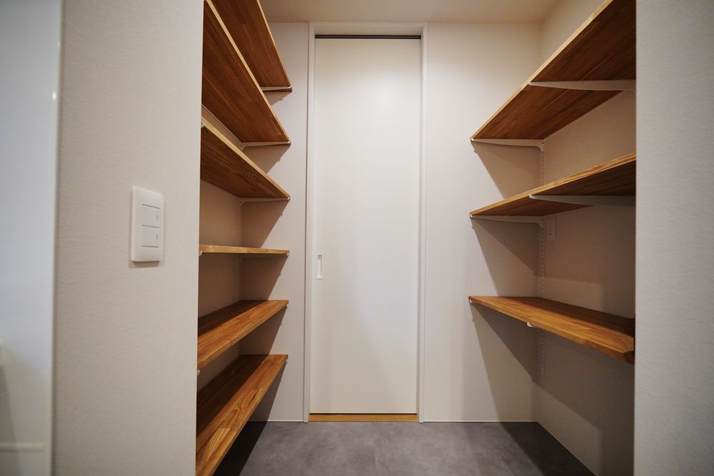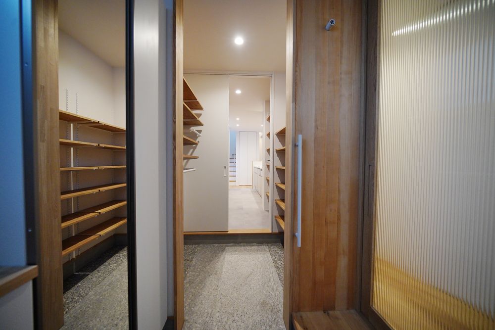 玄関から靴やコート収納、パントリーを通ってキッチンへと一直線に続く“裏動線”を設け、
