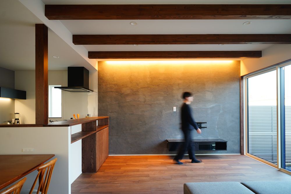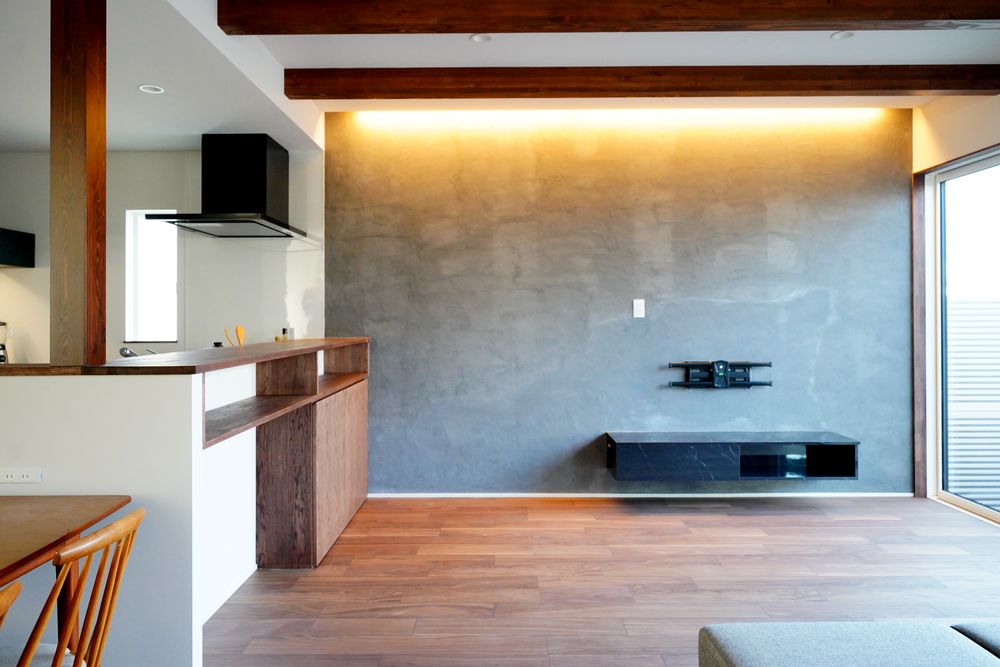 リビングにはコンクリート調の塗り壁を採用し、光をやさしく受け止める落ち着いた空気感を演出。