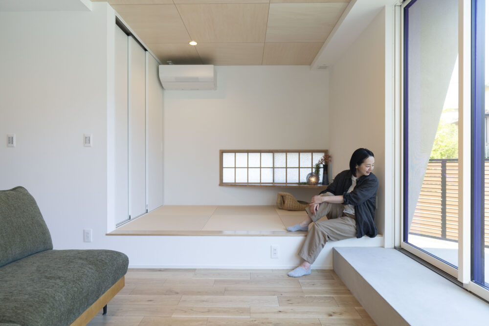 - リビング続きの小上がりの畳スペースや、モルタルデッキなどリビングのどこにいても家族が寛げるレイアウト