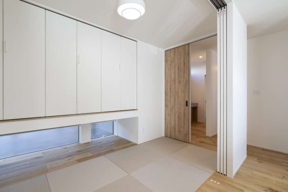 和室は、吊り収納の奥行きを深く取り、下のスペースを活用して布団が2組敷けるよう工夫。 吊り建具で掃除も楽に。奥は洗面室→ランドリールームと続く。