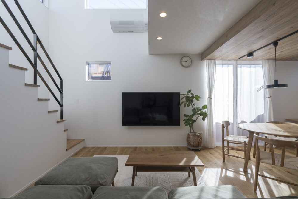 住宅街という立地ながらも、ゆとりのあるリビングに、同社提案の大きな吹き抜けと窓を設け理想をかなえた。