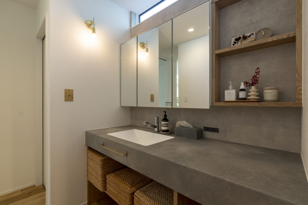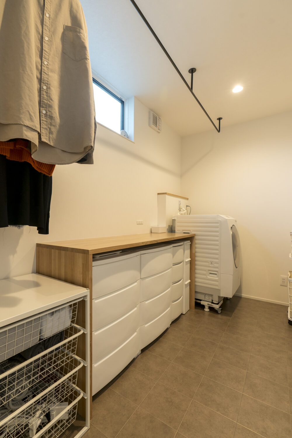 脱衣室兼ランドリールームは、カウンターを造作。一カ所で洗濯作業が完結できる。