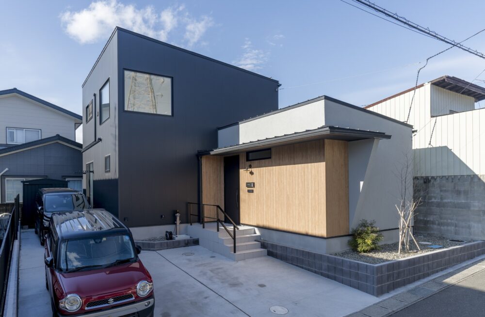 黒のガルバリウムに、塗り壁、木目を組み合わせたおしゃれな外観。コーヒーショップのようなスタイリッシュさが漂う。