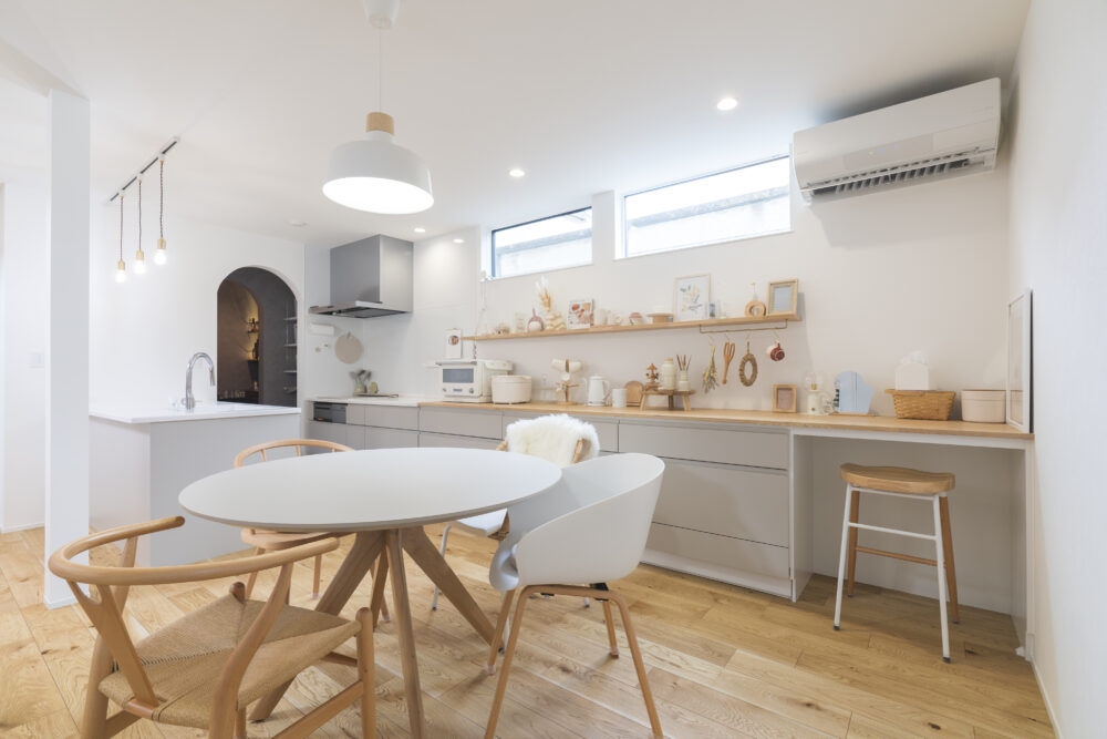 キッチンは作業スペースの広いセパレート型を採用し、コンロ幅に合わせて、壁いっぱいにカップボードを造作。