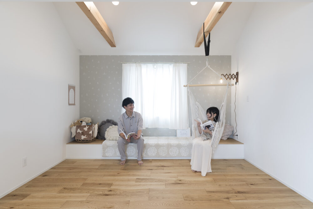 勾配天井を活かし梁にハンモックを吊るして、リラックスしながらゆったりと読書タイム。