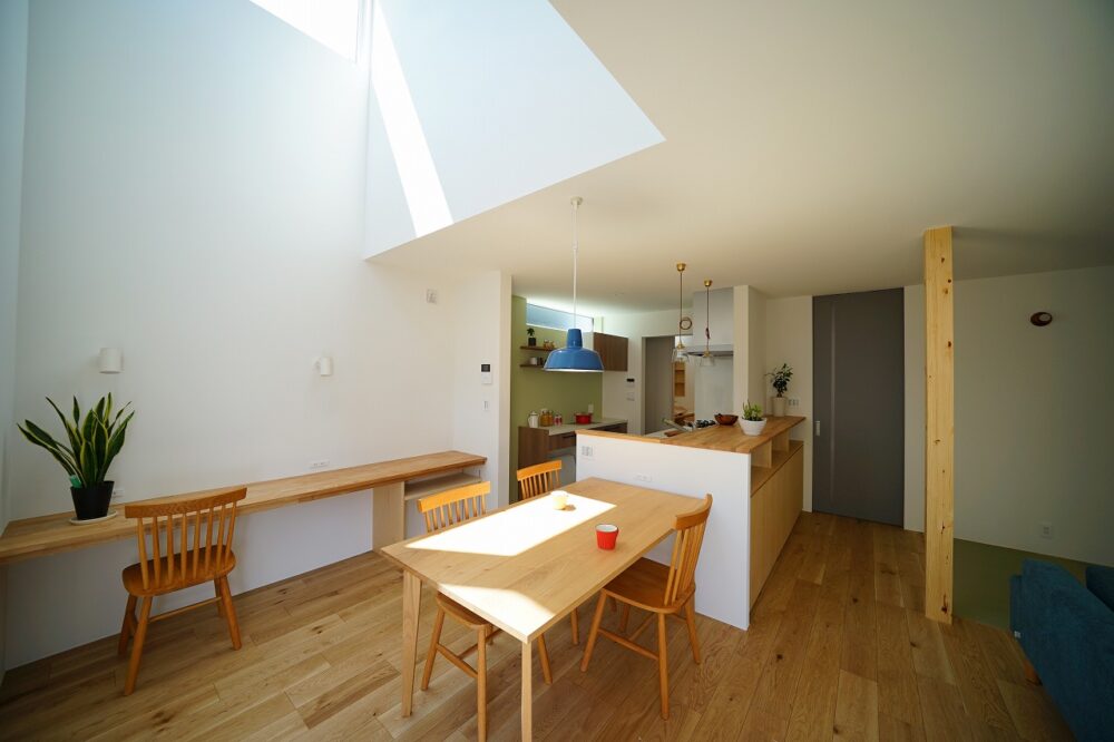 敷地は東南方向に開けた配置。 朝から自然光が入り、 日中も明るく、あたたかい空間が広がります。リビングに差し込む光、 時間とともに移ろう影など。天気のいい日は、 家の中にいるだけで気持ちが整う。 そんな日常を想定して設計されています。
