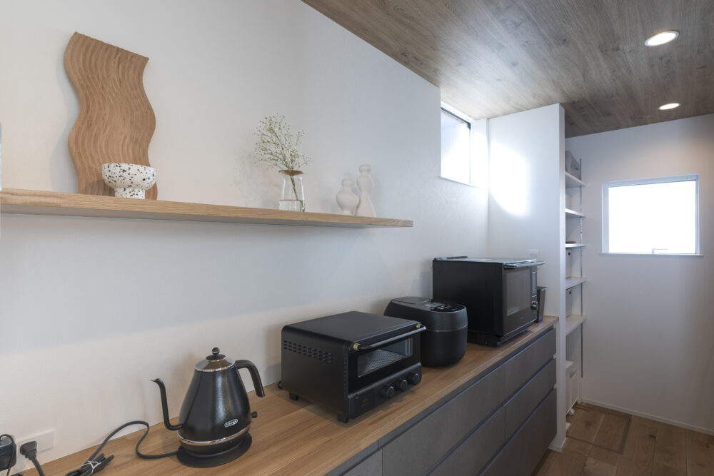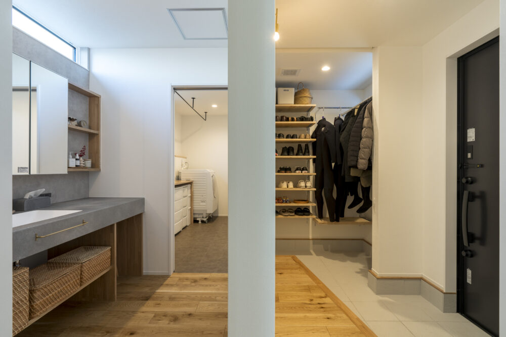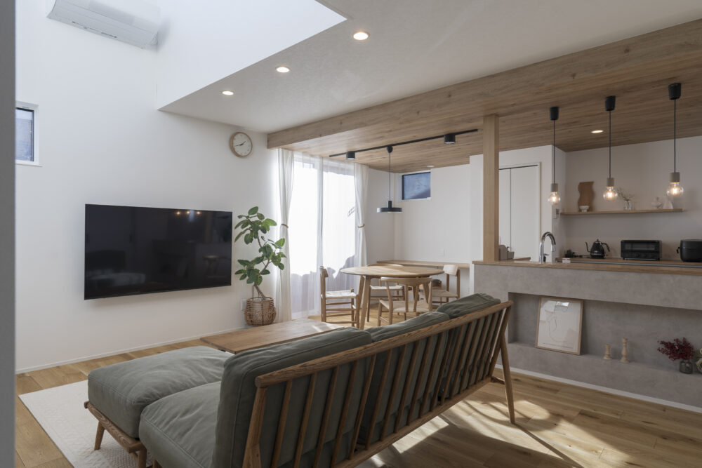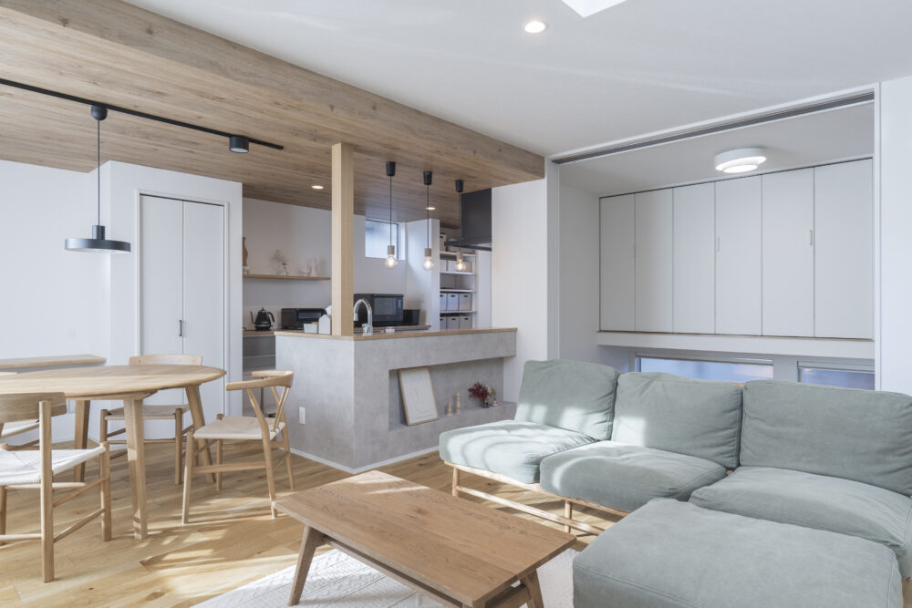 洗練された温もり コンセプト 無機質さをアクセントにしたやさしい空間 外観 黒のガルバリウムに、塗り壁、木目調のサイディングを組み合わせた外観 内観 吹き抜けと掃き出し窓で自然光が行き渡る明るく開放的なリビング ナチュラルな素材感と無機質なデザインを融合させ、洗練された中にも温かみのある空間に LDK奥の畳スペースは仕切って独立した部屋としても使え、 奥行き深めの吊り収納の下部を利用して布団2組が敷ける使い勝手の良い設計