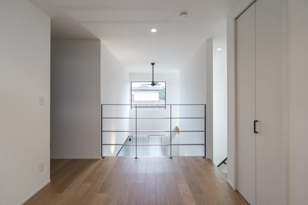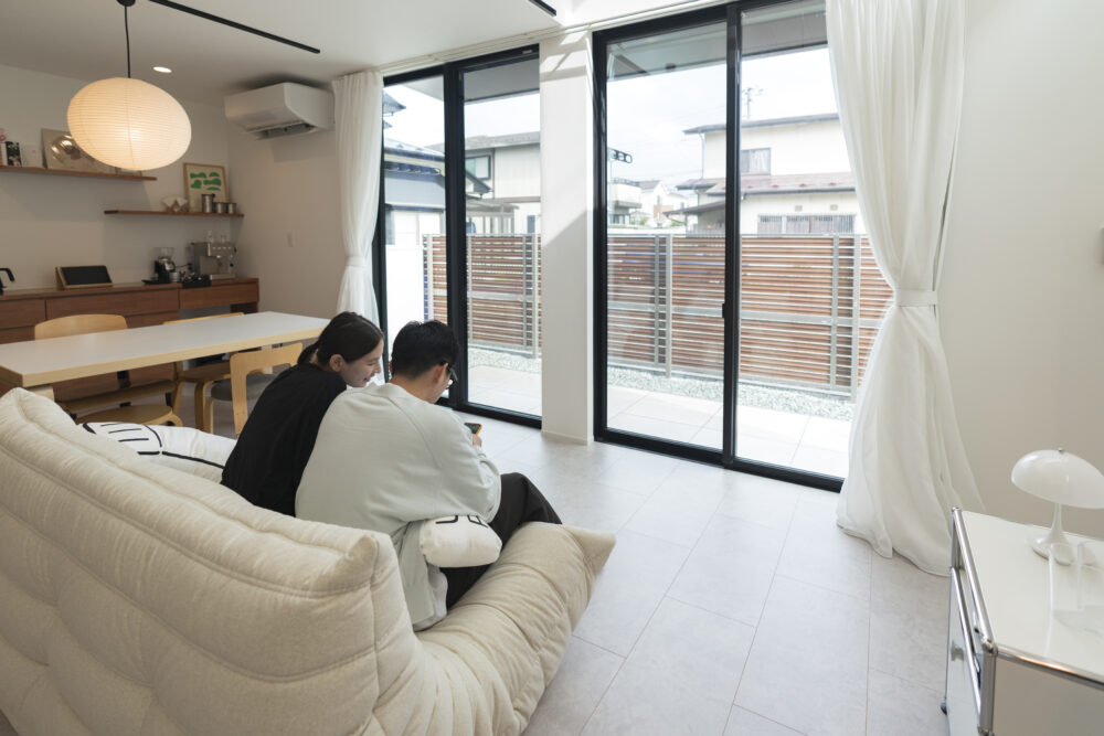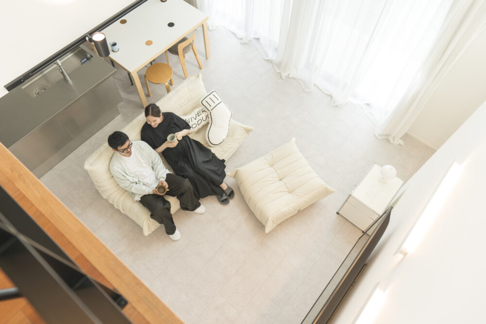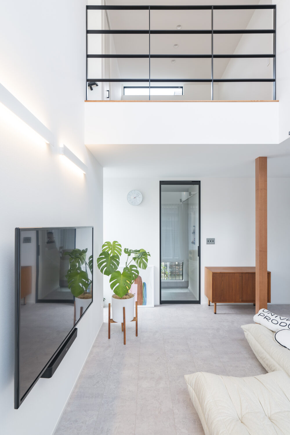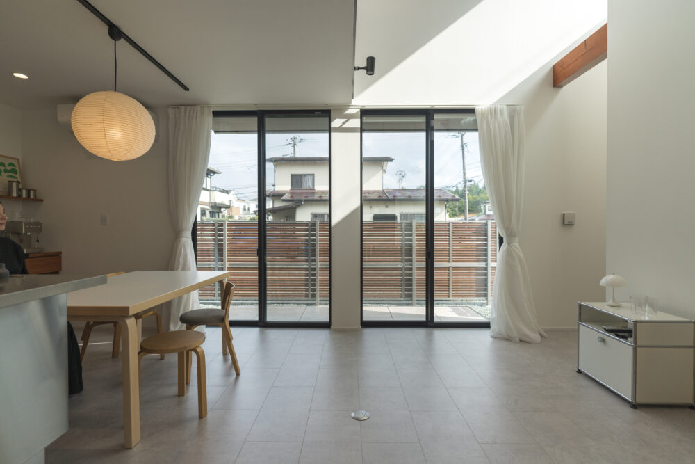 吹き抜けと大きなガラスドアが、開放感と明るさをもたらすリビング