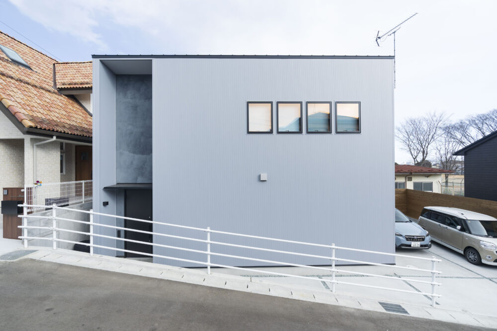 グレーのガルバリウムとコンクリート風の塗り壁を組み合わせた外観。