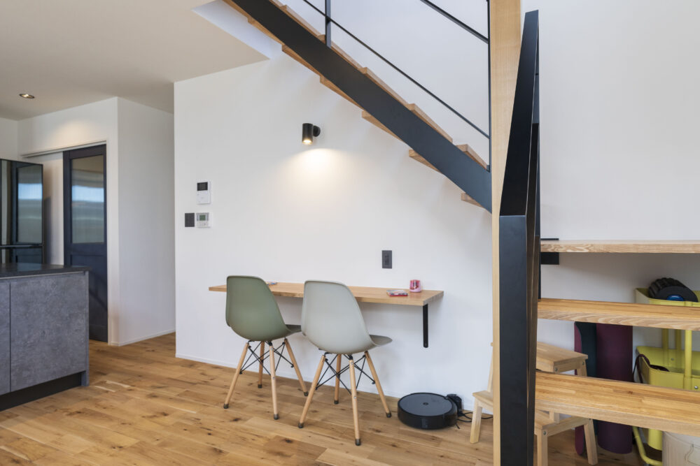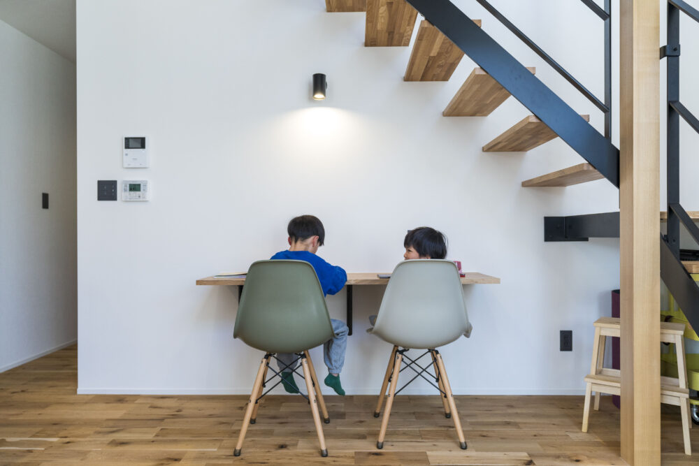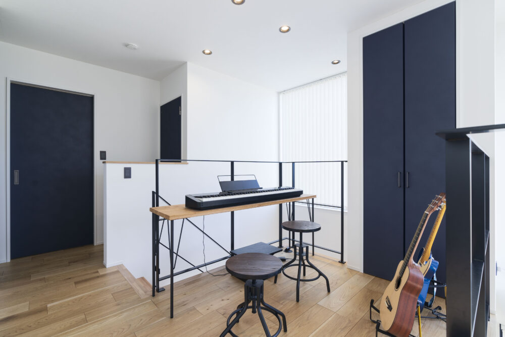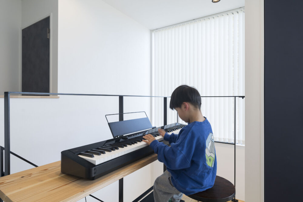 吹き抜けを通じて楽器の音色が家全体に心地よく響き、家族の日常に彩りを加えます。